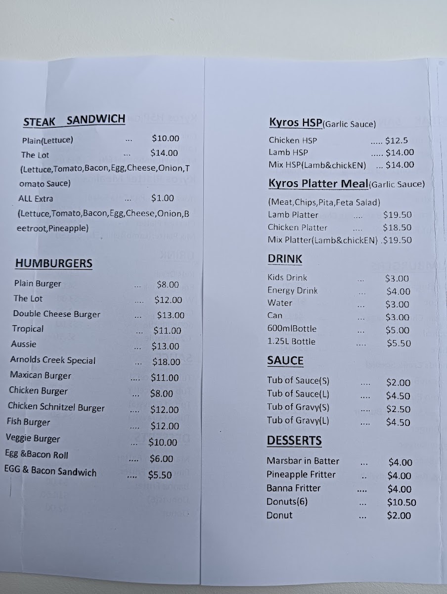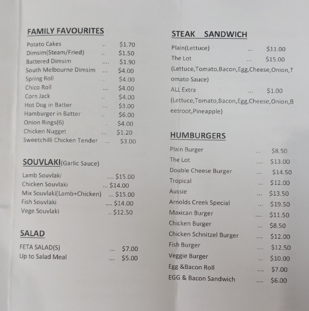 Arnold's Creek Fish & Chips offers a satisfying variety of options that cater to all tastes, with a strong focus on fresh fish and seafood. For fish lovers, their selection includes Flake, Barramundi, Butter Fish, Blue Grenadier, and Red Emperor, though prices aren't listed, these dishes promise a hearty, flavorful experience. If you're craving something crispy on the side, the menu offers several types of Chips, such as Minimum Chips and Large Chips, or for something extra indulgent, try Chips Gravy or Chips Cheese Gravy. For those looking for a quick snack or family-friendly options, the Family Favourites section includes tasty choices like Potato Cakes, Dimsim, Battered Dimsim, South Melbourne Dimsim, and Spring Roll. Additionally, their Souvlaki offerings provide a savory option for those looking for grilled meats, with choices like Lamb Souvlaki, Chicken Souvlaki, Mix Souvlaki, Fish Souvlaki, and Vege Souvlaki, offering a delightful range to suit different dietary preferences. Whether you're stopping in for a quick bite or a satisfying meal, Arnold's Creek Fish & Chips delivers a fulfilling menu that’s sure to please any palate.